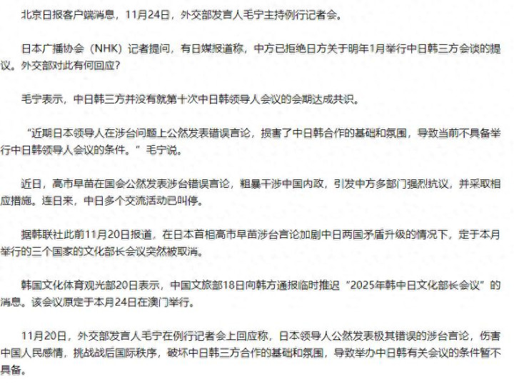 11月24日配资一流证券配资门户,在外交部例行记者会上,有日媒称,对于日方想要在明年1月举行中日韩三方会谈的提议,中方直接拒绝了。