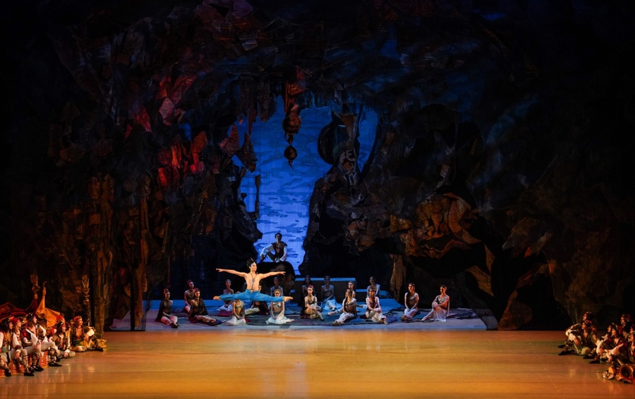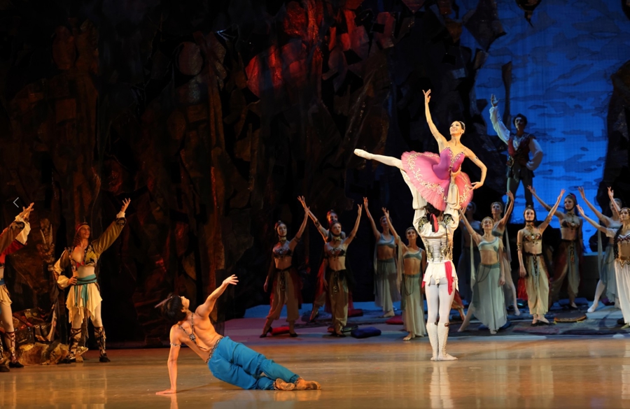 这是一个炫技的华彩舞段,米多拉面对康拉德被背叛、她即将被出卖给苏丹,编舞以32个挥鞭转的高难度技巧表达女主角在困境中的果断。捷廖什金娜在这段演绎中,不仅足尖技巧毫无瑕疵,她的速度和力度让她的身体如同一柄劈开舞台的利剑,剧场里的时间几乎因她而停滞。这个段落同时给了男舞者足够的发挥空间,金基珉的阿里连续5圈旁腿转,起跳轻盈,空中姿态凌厉豪迈,无愧于他在社交网络上获得的“飞人”称号。阿里起飞的片刻,现场观众的情绪也跟着飞了。