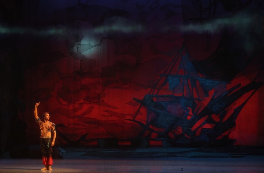 《海盗》自首次亮相就追求豪迈的舞台奇观,人物众多,布景和服装极尽华美,音乐、舞蹈和演出整体的色彩是极致绚烂的。马林斯基的这个演出版本,通过投影、绘景和实景的结合,创造美轮美奂的剧场视听现场。大幕拉开,投屏画面和绘制景片重叠在一起的视觉效果,把观众立刻带到风暴中的海面,实体的巨大海盗船在浓云和巨浪的画片里穿行,因为灯光的魔力,现场看起来远比好莱坞大片《加勒比海盗》的特效画面更惊人。道具海盗船的尺寸巨大,船身就比成人更高,船体上的帆和绳索细节俱全,四位男女主角稳坐上方仍显宽敞,舞团希望还原海上生活的美好想象。